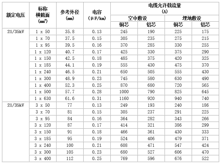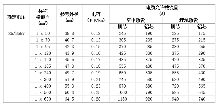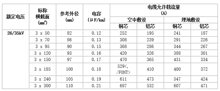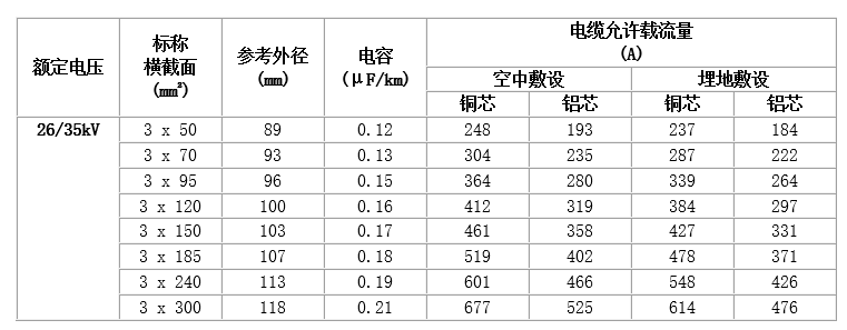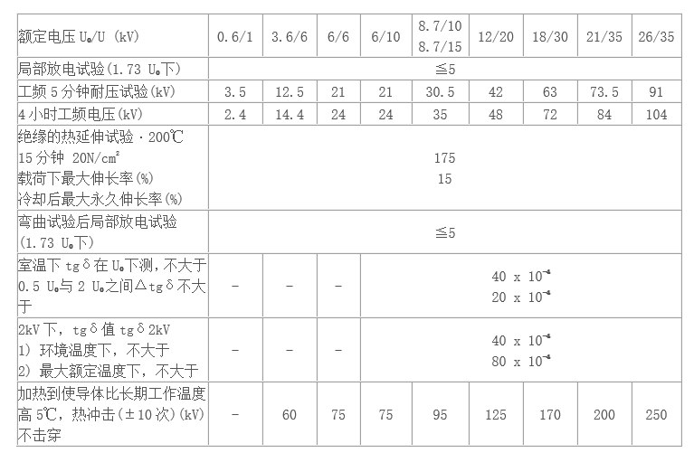 (1) 工頻額定電壓U0/U為3.6/6kV~26/35kV。
